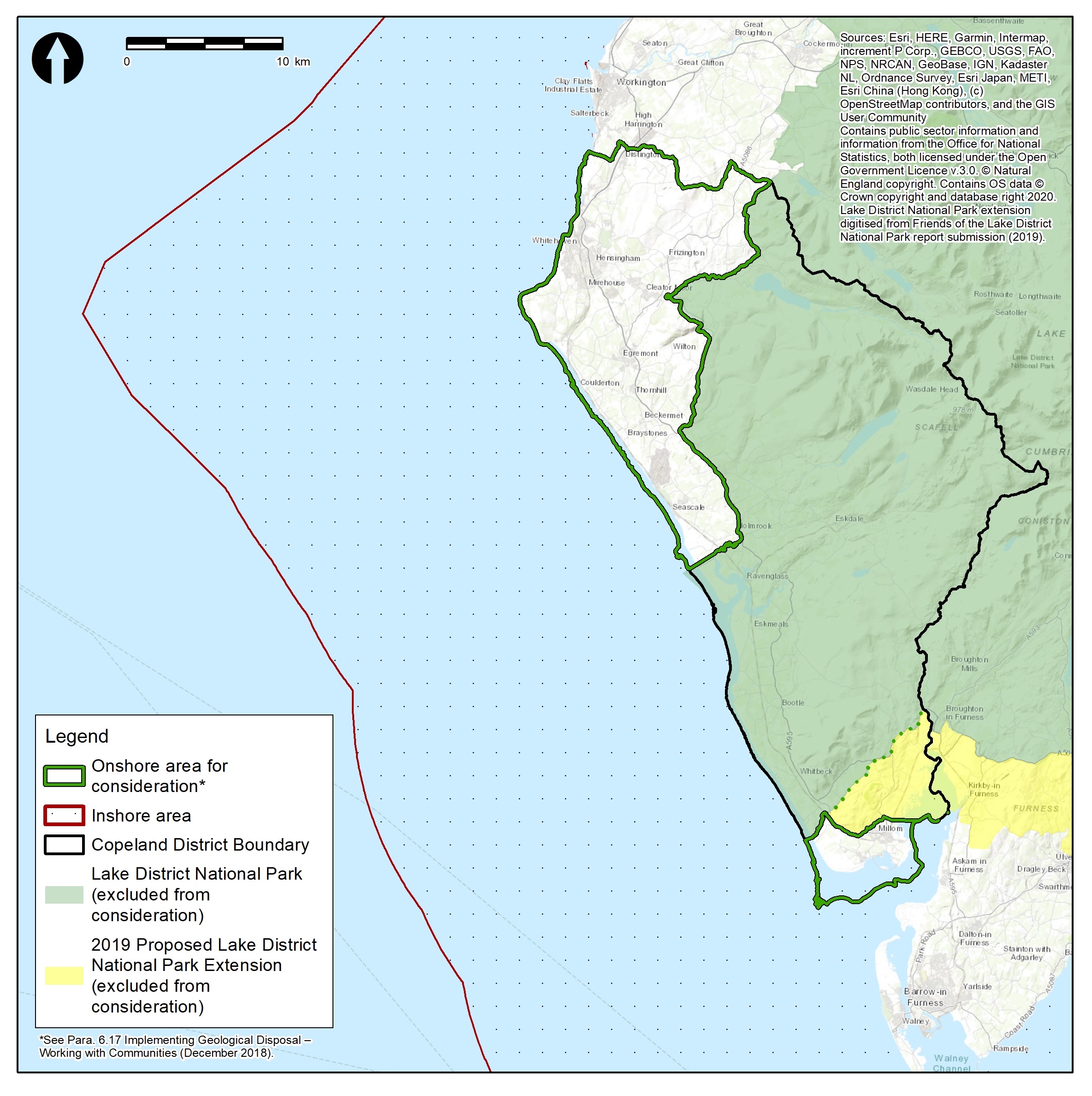 Using the Areas of Interest brought forward by the Interested Parties, the Working Group agreed a Working Group Area. The Copeland GDF Working Group Area considers the whole of the Borough of Copeland and adjacent inshore area up to 22.2km from the coastline, with the exclusion of the area within the boundary of the Lake District National Park and subsequently the 2019 proposed extension. No potential sites for a GDF have been identified at this stage.