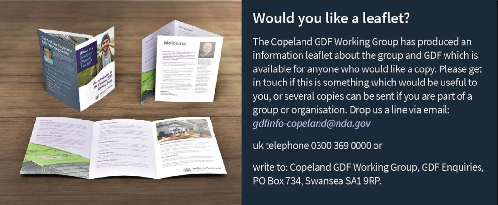 Secondly, you can get involved with the engagement sessions run by the Copeland Working Group, these sessions will enable you to examine and probe the data being used to inform the conversations – around GDF.