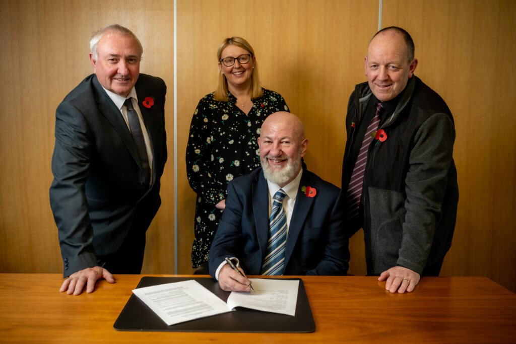 Left to right: David Moore, Copeland Portfolio Holder for Nuclear and Corporate Services, Copeland Council; Gillian Johnston, Community Engagement Manager, RWM; Interim Chair Mark Cullinan (seated) and Andy Pratt, Cumbria Association of Local Councils (Copeland District Association)