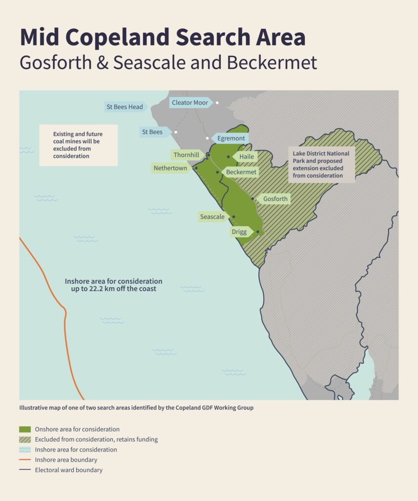 The development follows the recommendation of two Search Areas – one includes the electoral wards of Gosforth & Seascale and Beckermet (Mid Copeland) and the other includes the electoral wards of Millom and Black Combe & Scafell (South Copeland).