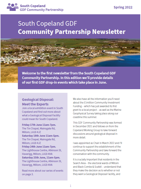 Welcome to the first newsletter from the South Copeland GDF Community Partnership. In this edition we’ll provide details of our first GDF drop-in events which take place in June.
