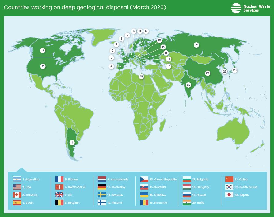 Geological disposal is internationally recognised as the best and safest option for managing longer-lived, more hazardous radioactive waste, following decades of science, technology and engineering research. A number of countries, including Sweden, Finland, France, Canada and Switzerland, have already implemented or are developing plans for this process. Among the most advanced is Finland which started constructing a GDF for spent nuclear fuel, called ‘Onkalo’, five years ago. In Sweden, a site at Forsmark has been identified following support by two communities, Osthammar and Oskarshamm. France has also identified a suitable site. Its waste management organisation, ANDRA, is preparing to submit applications for the Cigeo industrial geological disposal facility, located in the east of the country.