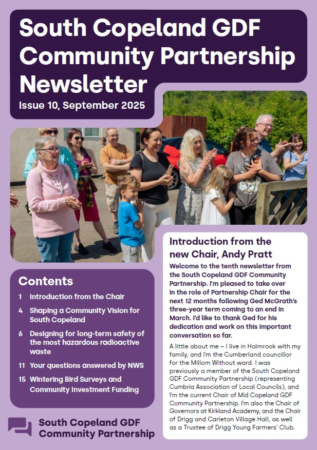 Welcome to the tenth newsletter from the South Copeland GDF Community Partnership. I’m pleased to take over in the role of Partnership Chair for the next 12 months following Ged McGrath’s three-year term coming to an end in March. I’d like to thank Ged for his dedication and work on this important conversation so far.