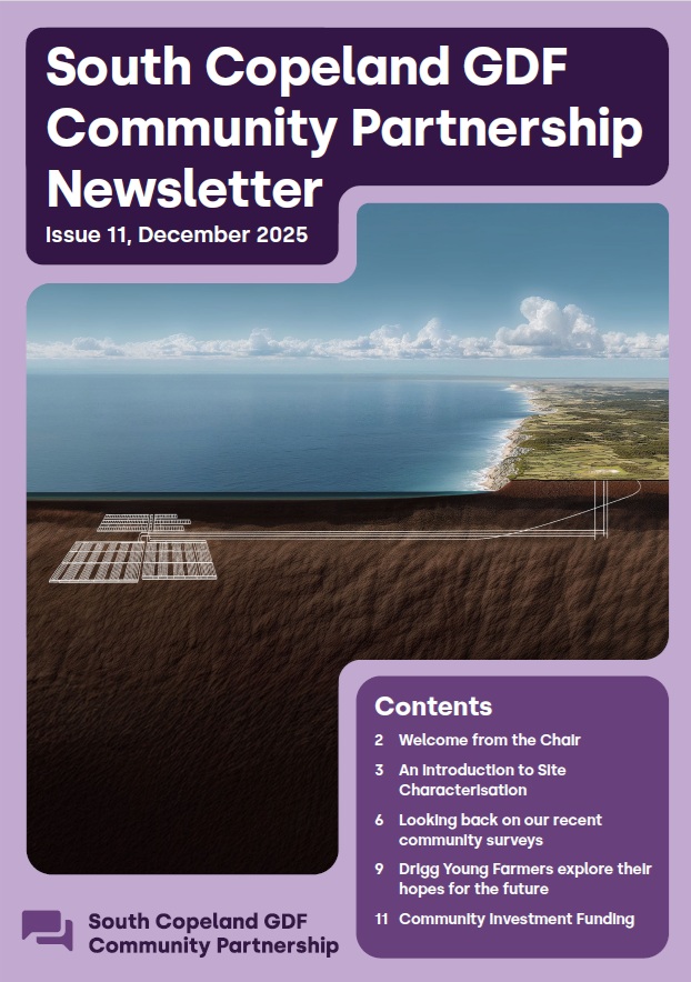 In this issue, you’ll find updates from Nuclear Waste Services (NWS) – the developer responsible for the proposed GDF – introducing Site Characterisation, the next stage of the siting process; insights from resident research tracking awareness and views over time; and a look at our recent Community Visioning activities with Drigg Young Farmers, helping to shape what a future vision for the area could look like.